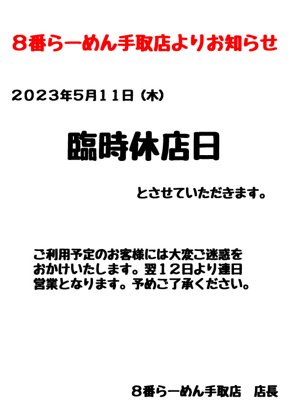 2023年5月11日(木)、8番らーめん手取店は臨時休店とさせていただきます。